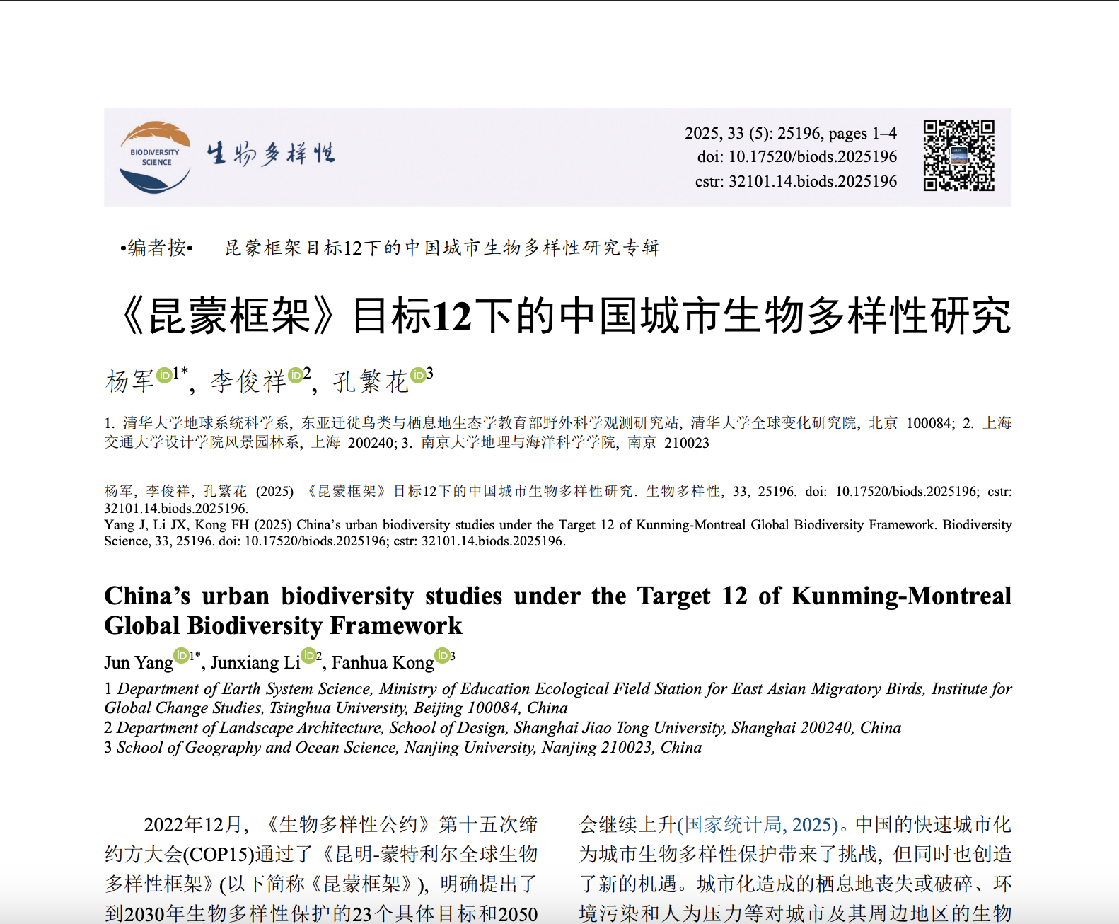 《生物多樣性》期刊 PDF,探討昆明—蒙特利爾框架目標 12 與城市生物多樣性研究。